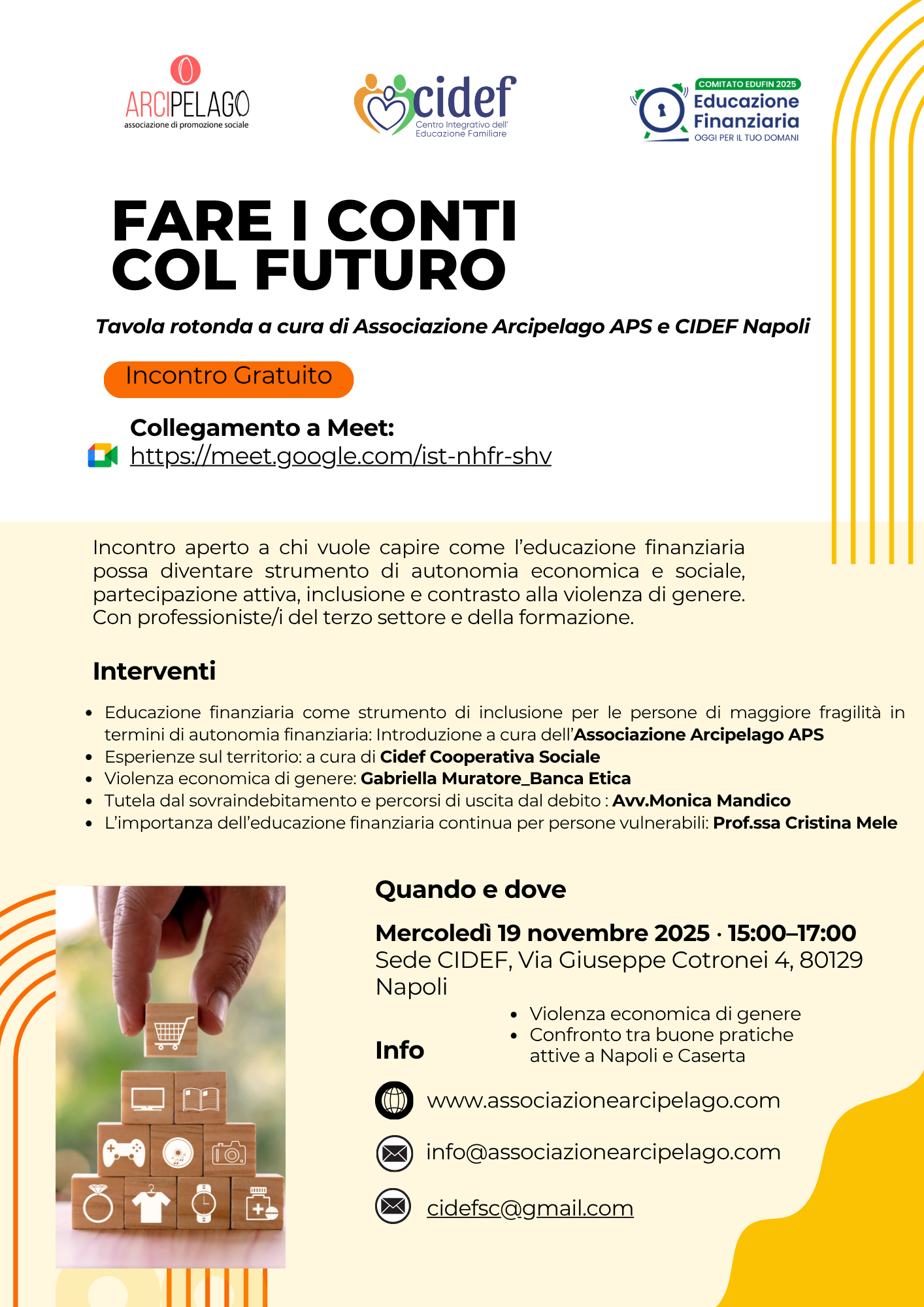 L’Associazione Arcipelago prende parte, insieme a CIDEF – Centro Integrativo Dell’Educazione Familiare Cooperativa Sociale, a incontri rivolti a giovani con basso reddito, inoccupati o disoccupati, residenti nel centro di Napoli, con l’obiettivo di potenziare le competenze trasversali (decision making, problem solving, pensiero critico, creatività) e l’informazione rispetto al tema dell’educazione finanziaria, offrendo strumenti pratici per la gestione delle proprie economie.
